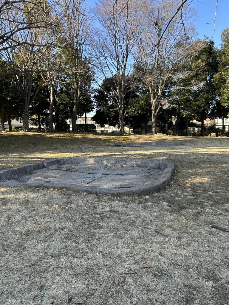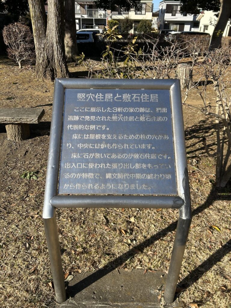 開放感がある芝生広場を歩いていると地面に遺構を発見。近くには、解説板が立っていました。駐車場はありませんが、趣のある休憩所やトイレがあります。縄文時代中期(約4500年前)の私たちのルーツを感じられる公園。なぜか私に似たひとり歩きしている縄文人が脳裏に浮かびました。