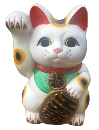 右手を挙げ金運をまねく8匹の中で一番大きなまねき猫